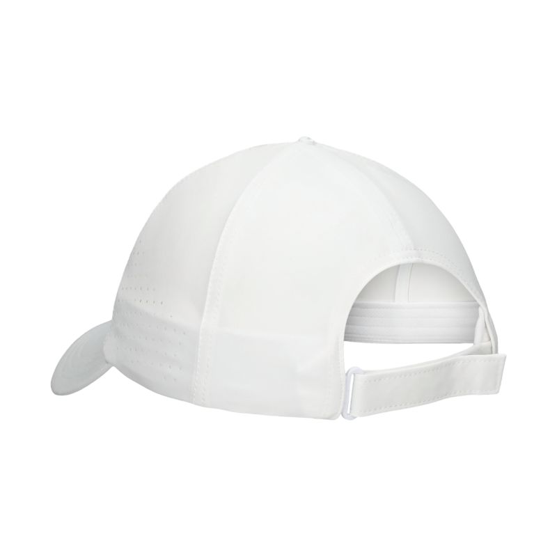 Asics Performance White Cap 3043A139 100 This Asics cap is a lightweight, sporty design designed for active play, especially tennis. It provides good ventilation, a comfortable fit, and sun protection. Velcro adjustment and a shorter, curved brim enhance comfort, while a minimalist logo creates a modern look. Perforations. Specifications: Material: 90% polyester, 10% elastane Head circumference: 57 cm