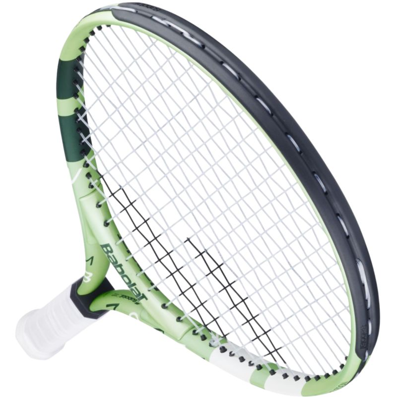 Babolat Wimbledon 21 Junior Mint Tennis Racket 140527 This Babolat racket is perfect for recreational tennis games. Designed for children. The design is inspired by the Grand Slam tournament - London's Wimbledon. The construction is made of aluminum. The handle has a factory overgrip. Technical data: Age: 5-7 years or height: 105-120 cm Handle size: L0 Material: aluminum Weight (unstrung): 190 g Racket length: 534 cm / 21 in String pattern: 16x19 in Balance: 26 Head area: 610 cm² / 95 in Grip: factory Pre-strung: yes Cover included: no