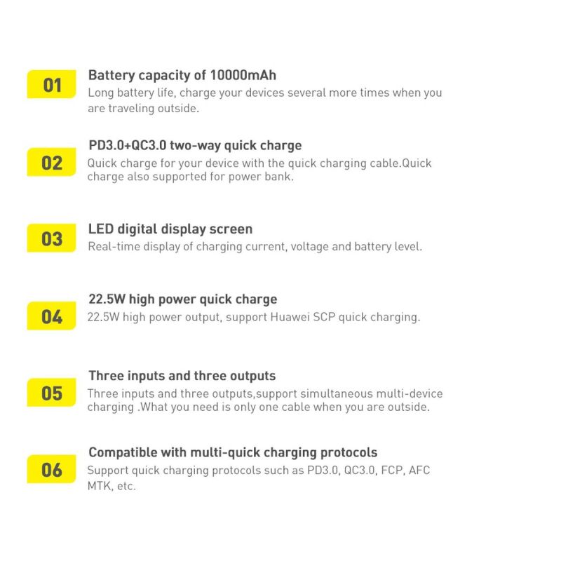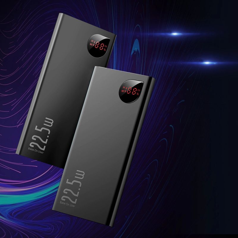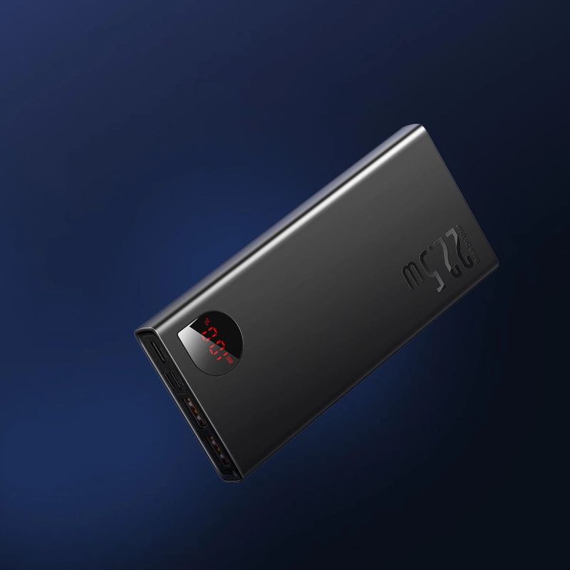 The Baseus brand power bank supports many fast charging standards, including SCP, Quick Charge 3.0, Power Delivery 3.0. It has 2 built-in USB-A output ports, a USB-C input-output port, and Lightning and Micro-USB input ports. The product supports an output current of maximum 22.5W. The LED screen on its housing indicates the current value at which it is currently working and the battery charge level. The integrated circuit supports many safeguards that protect connected devices from damage.