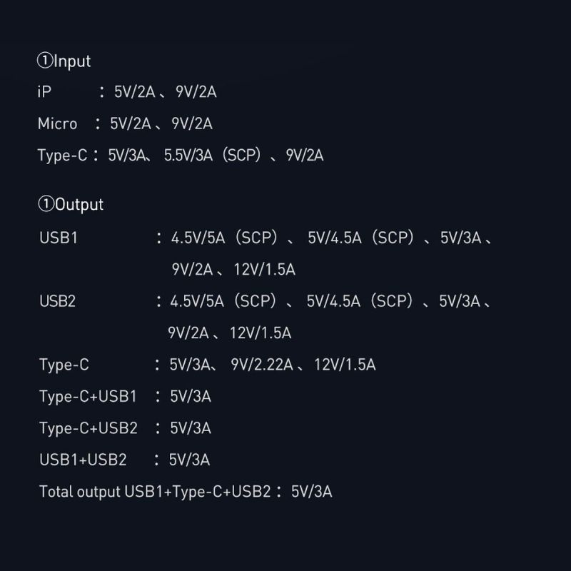 - USB-C: 5V/3A, 5.5V/3A (SCP), 9V/2A