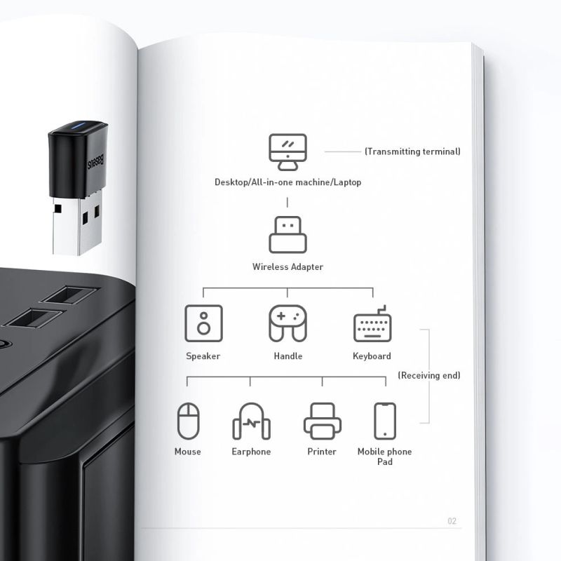 Compact USB Bluetooth 5.0 adapter. This miniature device extends the functionality of your laptop or desktop computer with Bluetooth wireless connectivity. It does not require installing additional drivers (Plug & Play). It allows you to connect many peripherals to your computer, such as wireless mice and keyboards, Bluetooth speakers and headphones, game pads and phones for easy data transfer. With its help, you can connect up to 7 devices at the same time.