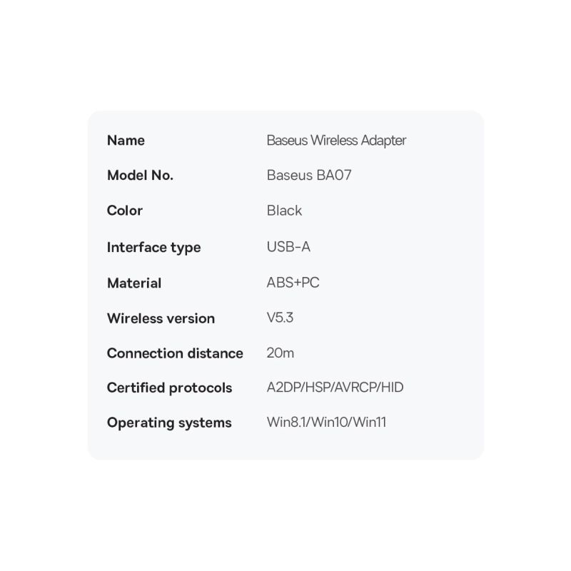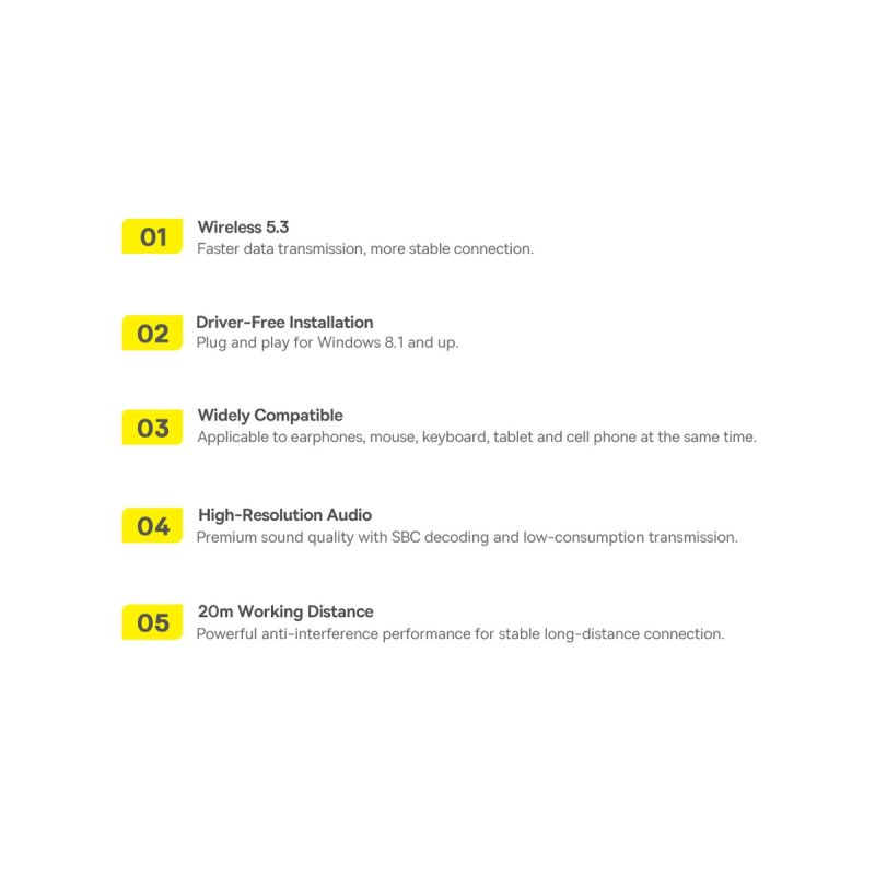 Compact USB Bluetooth 5.3 adapter. This miniature device extends the functionality of your laptop or desktop computer with Bluetooth wireless connectivity. It allows you to connect many peripherals to your computer, such as wireless mice and keyboards, Bluetooth speakers and headphones, game pads and phones for easy data transfer. With its help, you can connect to several devices at the same time. The operating range of such a device is up to 20m. Driver installation is required for the device to work properly.