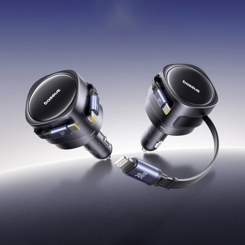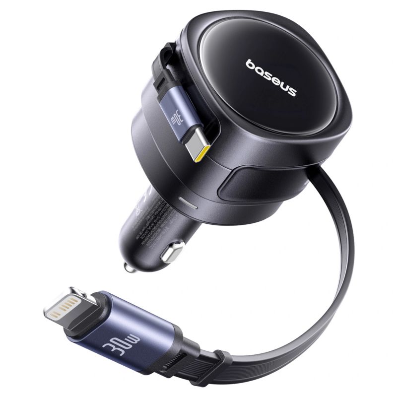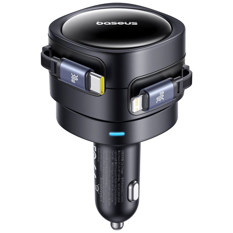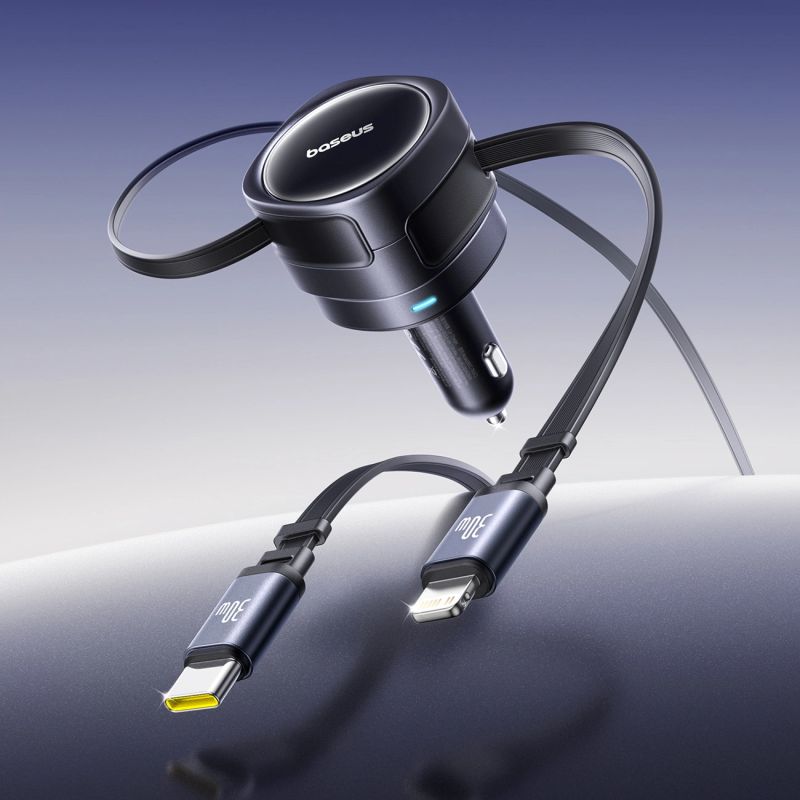 Baseus Enjoyment Max 60W Car Charger with Retractable USB-C and Lightning Cables - Black