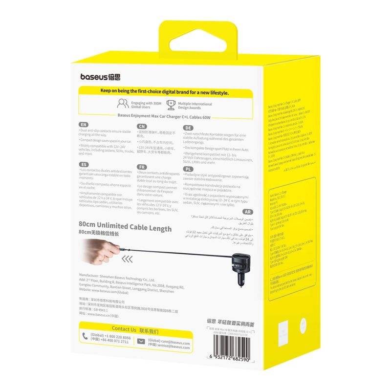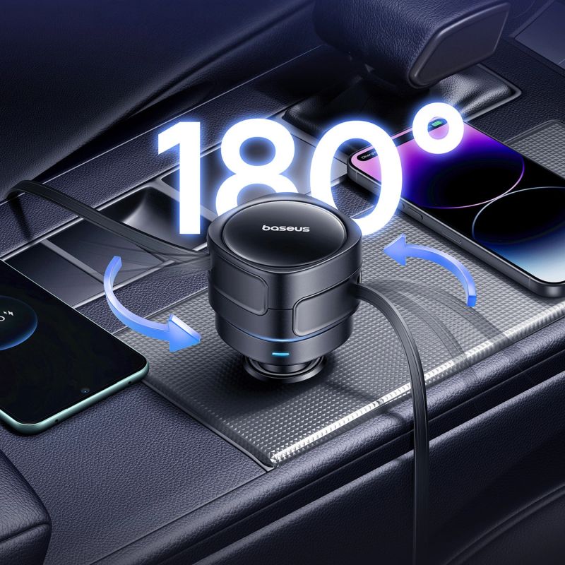 The Baseus Enjoyment Max 60W is a practical car charger equipped with two retractable cables – USB-C and Lightning. It allows you to charge two devices simultaneously without the need for additional cables. The 180° rotatable design makes it easy to fit into your car's interior, and a total power output of up to 60W ensures fast and stable power on every trip. The wide input voltage range of 12-24V allows it to be used in both passenger cars and other vehicles.