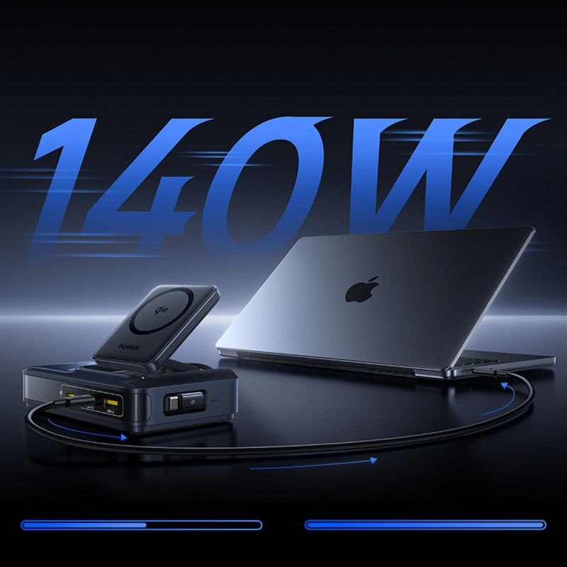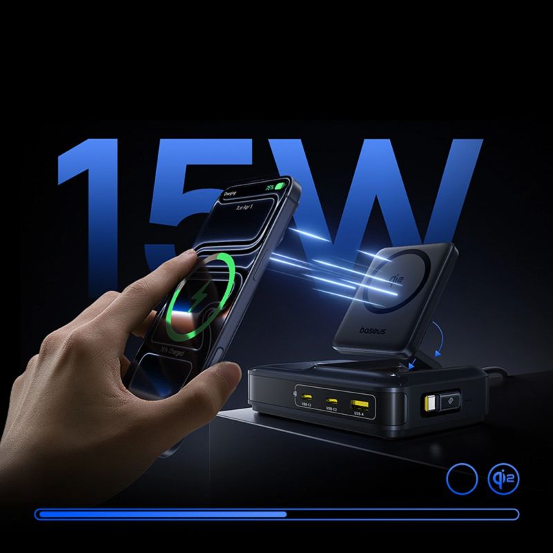 The Baseus Nomos NH21 is an advanced charging station designed to efficiently and efficiently power multiple devices simultaneously. A combined output of up to 160W allows you to power laptops, smartphones, and other devices without any performance drops. The built-in, retractable USB-C cable increases convenience and eliminates the need for additional cables. Wireless charging support up to 15W expands the usability. The compact desktop design helps keep your workspace tidy. This solution integrates charging for multiple devices in one place.