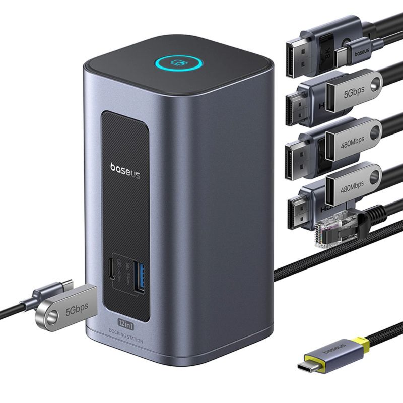 The Baseus Nomos NU1 Air Spacemate is an advanced 12-in-1 docking station designed for laptop and computer users who demand maximum functionality. It supports multiple ports simultaneously, allowing you to connect monitors, accessories, and a wired network in one place. Support for multiple displays and fast data transfers up to 10 Gbps increase work efficiency. A USB-C port with Power Delivery up to 100W allows you to simultaneously charge your laptop while using the device. The stable construction and well-thought-out port layout simplify workspace organization. This solution organizes your space and increases the comfort of everyday use.