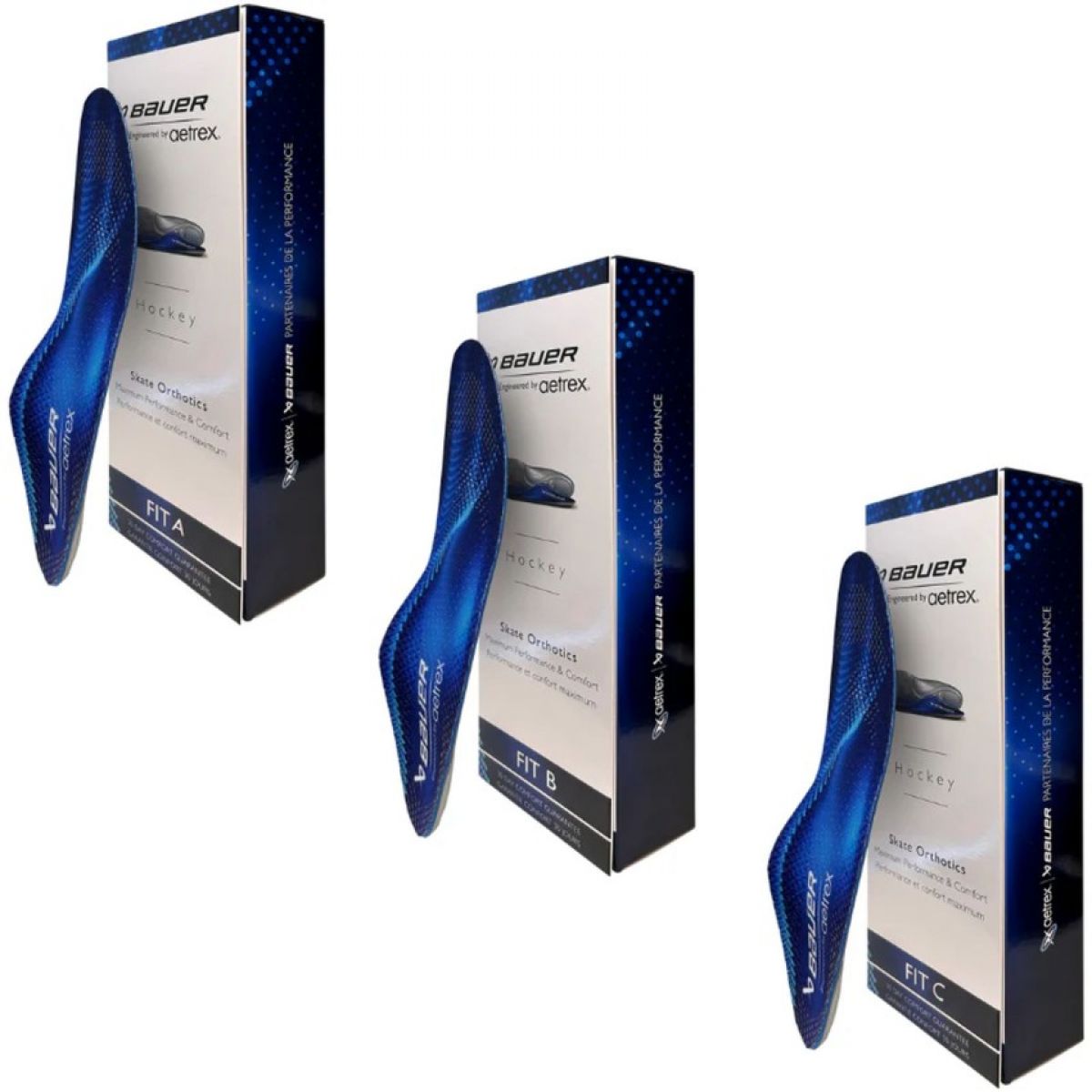 Aetrex Orthotic Hockey Skate Insoles. The foot is composed of a complex system of bones, ligaments, and tendons that must be incredibly flexible and stable during skating. Aetrex® orthotic insoles for ice skaters are designed to increase strength and power by eliminating negative space in the shoe and stabilizing the foot to improve efficiency with every step. Using data and knowledge from over 50 million foot scans, Aetrex®, a leader in orthotic insoles, has partnered with Bauer Hockey to develop three specialized insoles for ice skates. These insoles are designed to help address common foot problems and discomfort that can result from overpronation, forefoot compression, and inadequate arch support. Key Features: Fit A Insole: Designed for skaters with low or flat arches. It features medial rearfoot support and longitudinal arch support to keep the foot in proper alignment. Fit B Insole: Designed for skaters with a medium arch and minimal pronation. Designed to absorb shock, stabilize the foot, and improve the efficiency of each stride. Fit C Insole: Designed for skaters with a high arch and a high forefoot pressure. It helps reduce pressure on the metatarsal and provides the cushioning and support necessary for more even pressure distribution. Aetrex Orthotic hockey skate insoles are designed to provide excellent support and comfort for all foot types. With a precise fit and advanced materials, these insoles help improve performance, stability, and comfort while skating. Choose the right model for your needs and enjoy better control and comfort on the ice.