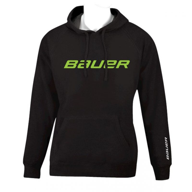 - There is a Bauer logo on the front of the sweatshirt and on the left sleeve.