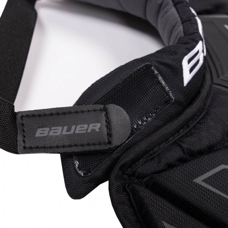 The Bauer Elite Senior Goalie Neck Guard is a great option for goalkeepers who don't need to wear a certified neck guard but want extra protection for their collarbone. The Elite collarbone guard is made of a durable, abrasion-resistant nylon upper, while the back uses Bauer's ThermoMax to keep you ventilated throughout the game. It's also worth noting the use of a new, more durable Velcro strap than other Bauer neck guards. Collar and Collarbone: The collar is significantly shorter than the Pro neck guard and utilizes a soft ThermoMax insert. The collarbone section uses a blend of Rebound Control Foam and other HD foams for enhanced collarbone protection. Ergonomic collar design. Inner lining: THERMOMAX. Outer material: Nylon. No certification. Size: 13.5"-15.5" / 34cm-39cm