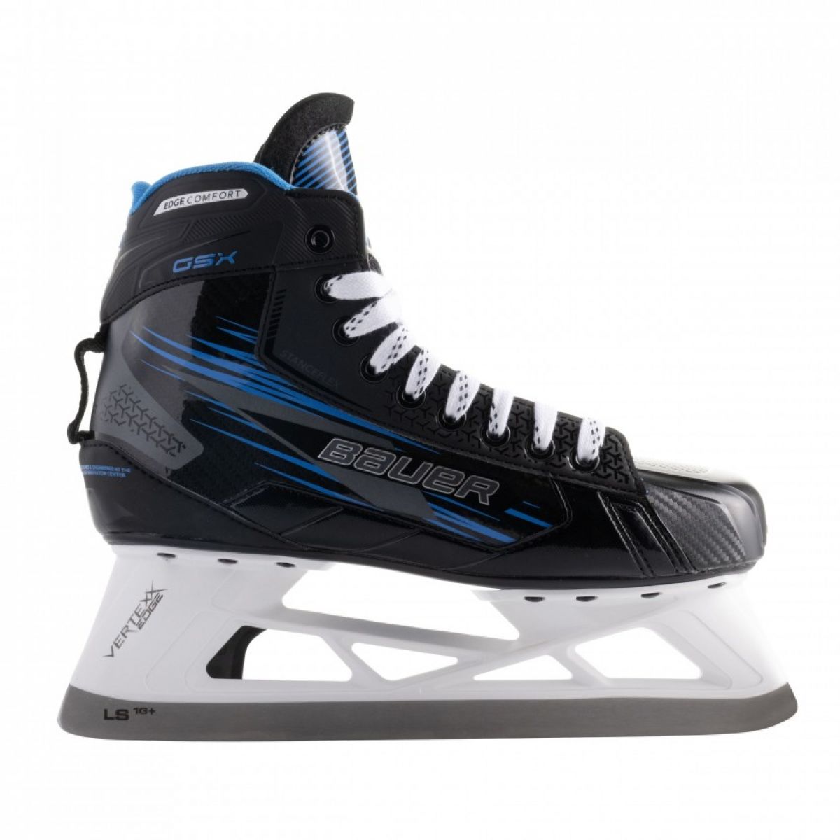 Bauer GSX '24 Junior Goalkeeper Skates: Experience comfort on the court! These skates are designed with a traditional boot style, offering a softer stiffness and a deeper fit. These skates are the perfect choice for aspiring amateur goalkeepers, providing comfort and functionality on the ice. Key Features: Boot Quarter: Fiber composite with Stanceflex technology allows for greater forward flexibility and a soft lining for enhanced comfort. Lightweight TPU Outsole: Reduced weight on the foot allows for faster movement around the net, increasing efficiency and reaction speed. VERTEXX Blade: First featured on the youth version of the GSX Goal Skate, this distinctive blade promotes the preferred angle of attack and approach for goalkeepers and allows for quick blade changes. LS1G Blade: Strong, lightweight, and built to withstand every push and release, ensuring durability and reliability during play. The Bauer GSX '24 Jr Goalie Skates are an excellent choice for goalkeepers of all skill levels. Perfect for those just starting out in hockey or playing recreationally. Featuring innovative features like the STANCEFLEX Quarter, lightweight TPU sole, and VERTEXX blade, these skates offer exceptional comfort, mobility, and durability. TECHNICAL SPECIFICATIONS: Intended Use: Hockey, Jr. Goalie; Blade and Blade: Vertexx Edge, LS1G+; Material: Fiber composite with Stanceflex technology; Tongue: Felt; Blade interchangeability with EDGE system: Yes; Thermoforming: Yes; Lining: Microfiber, Memory Foam