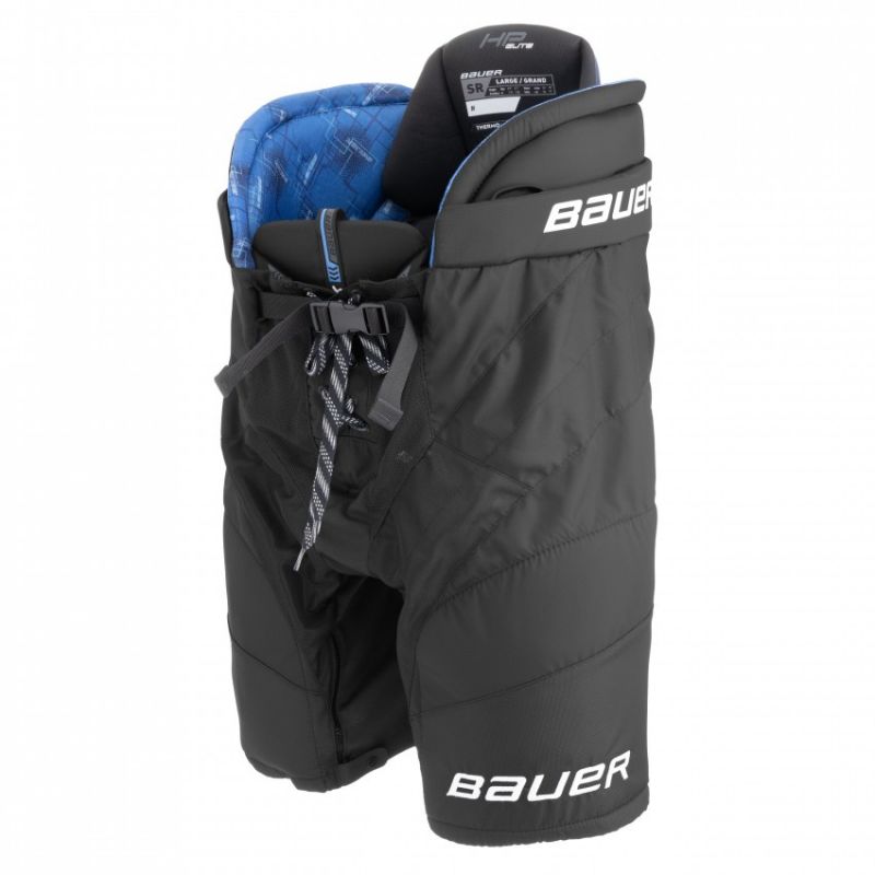 Bauer HP Elite Sr. Hockey Pants: Hit the ice with the protection you need to perform at your best. The Bauer HP Elite Sr. combines classic hockey style with modern design, providing elite players with optimal performance. Key Features: Integrated Spine Protector: Enjoy protection in key areas of the lower back with high-density foam inserts in the center of the pants. 840D Nylon Material: Designed to last for seasons. The pants are made of water-resistant nylon fabric that withstands the wear and tear of the most intense moments of play. HD Foam Insert: Provides additional hip protection with lightweight foam placed in high-impact areas. TECHNICAL SPECIFICATIONS Intended use: Ice hockey, field player, Elite Sr Material: A blend of durable nylon and stretch zones Protection: Spine: Independent spine protector with molded HD foam insert Kidney: One-piece kidney protector with molded PE insert Hip: One-piece hip protector with classic fit Thigh protector: Molded PE insert and MD foam Waistband: Waist strap with side buckle Adjustment: Length adjustment +1" Padding: THERMOMAX padding