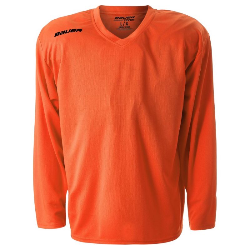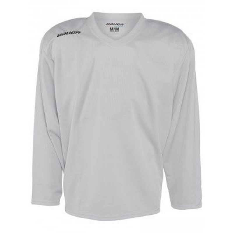 Bauer Kids' Hockey Jersey. Lightweight and durable, perfect for training, but can also be worn during games. Features ample space for customization. Embroidered Bauer logo on the right collarbone. 100% polyester, 170 g/m². Reinforced V-neck seams. Soft to the touch. The front of the jersey features the Bauer logo on the right side. The back of the jersey is blank, but team logos can be printed. Size: Senior