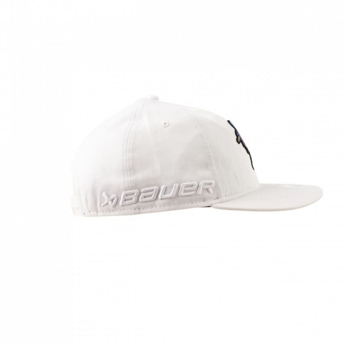 - This white snapback cap features a large embroidery on the front with the Bauer logo embroidered in a fun hockey frame.