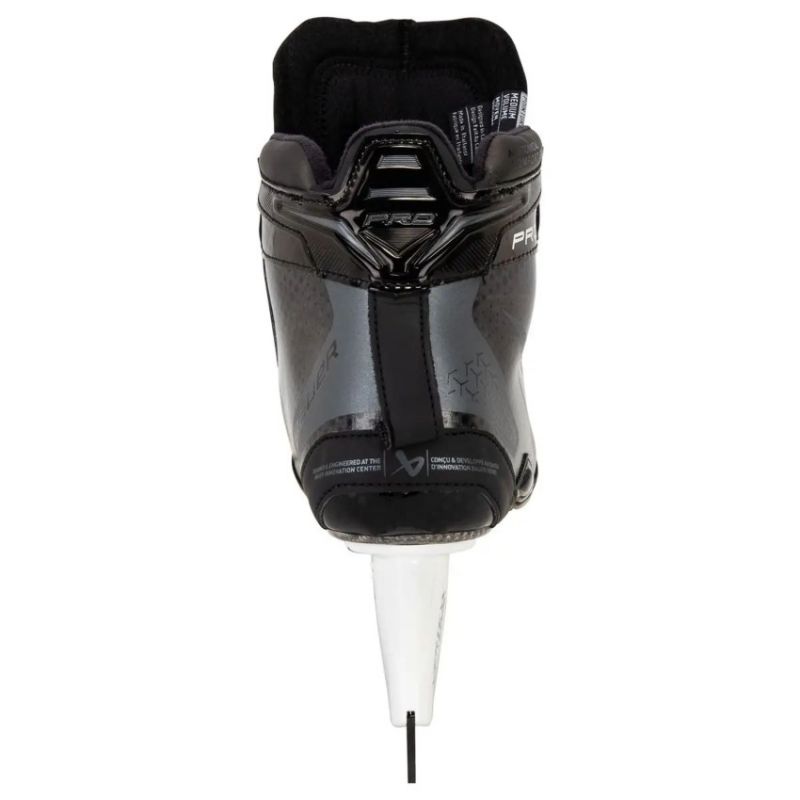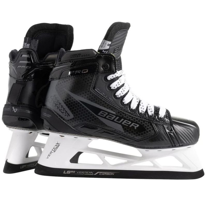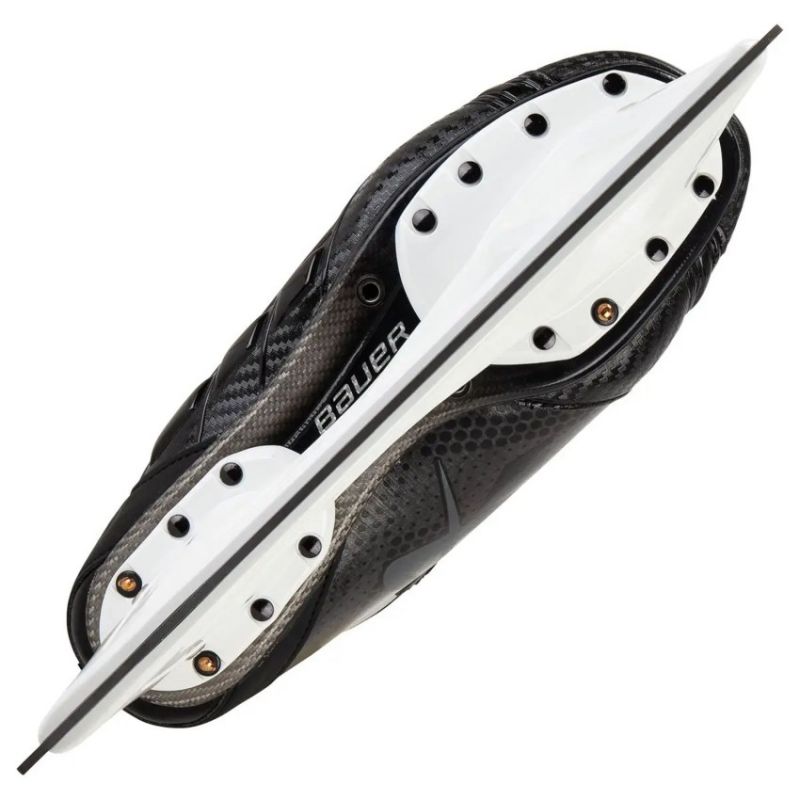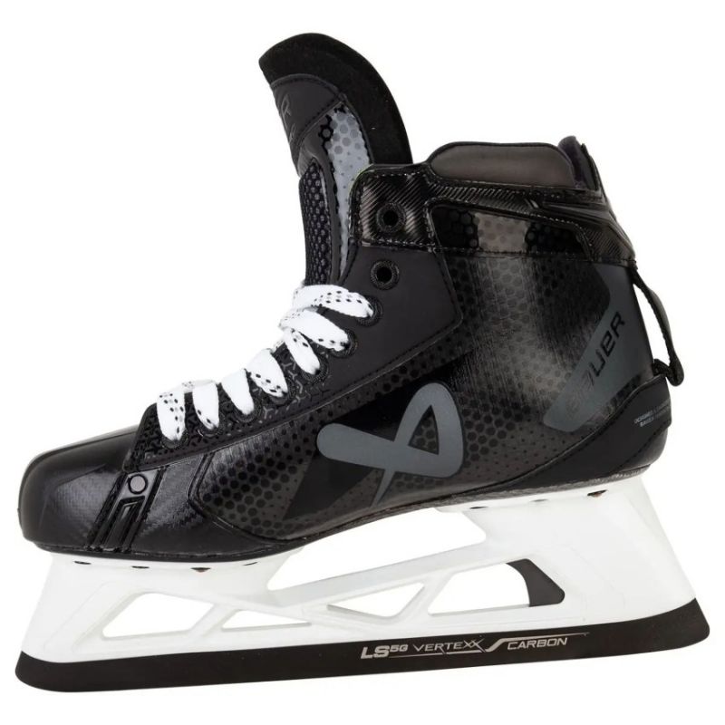 Top model of Bauer goalie skate in 2012 Skate angle to the ice surface increased by 28% Additional BAUER ALIVE composite coatings reinforcing the liner Reinforced side walls of the goalie skate Contoured tongue of the skate boot 3mm replaceable high-strength blade