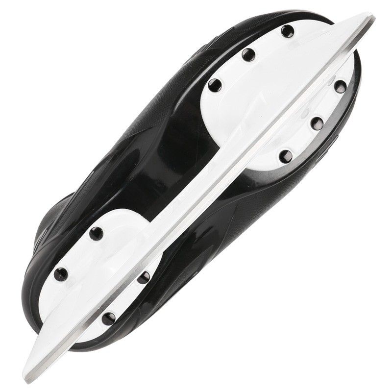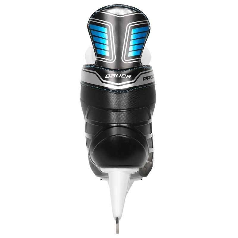 Bauer Prodigy Jr Hockey Skates. The Prodigy series focuses on lightweight, adjustable features that will satisfy the young player just beginning to learn the game. Born from Bauer's deep hockey knowledge, the Prodigy line gives your child the confidence to grow into the game while enjoying every moment. Built on a flexible boot construction with an integrated toe cap, this skate is sure to provide exceptional support for players still developing the muscle set needed to move around the rink. Internally, a comfortable EVA ankle padding combined with a microfiber lining provides a comfortable base that accommodates almost any foot type. What makes the Prodigy skates unique is their simplicity for younger players. The traditional lacing system has been replaced with a simple pull-and-close system, making tightening easier and providing a perfect fit. Marked "right" and "left" handles make it easy for players to learn how to put on their own equipment. Finally, a removable liner provides an adjustable fit as the player grows. The liner in the skate allows for a custom fit starting at the lower end of the size range, and as the player grows, the liner can be removed for extended durability. For young players who want to learn about equipment and the game of hockey for the first time, there's no better choice than the Bauer Prodigy line. Injected boot with integrated toe. Brushed nylon. TuuK Lightspeed Pro blade (for improved balance). Removable liner allows for size adjustments. A special lacing system helps to tie the boot easily and with less effort. TuuK blade. Size: Junior.