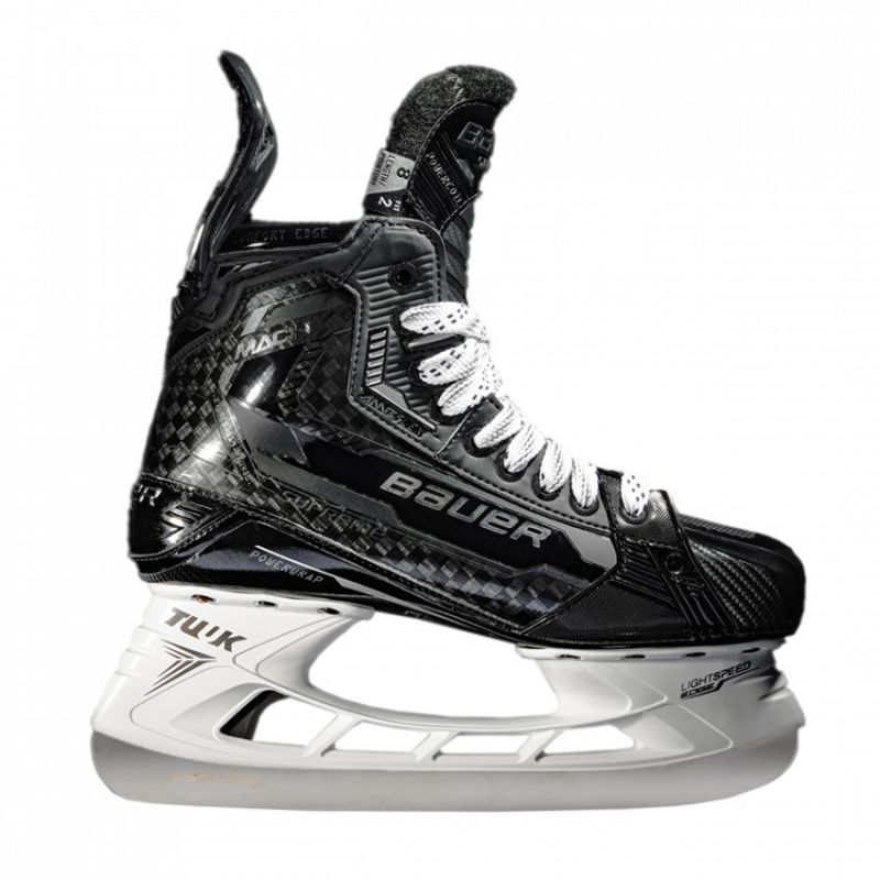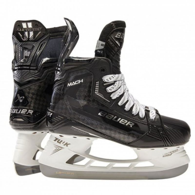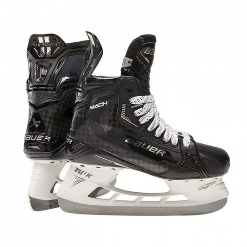 Bauer Supreme Mach Int Hockey Skates: A completely redesigned skate for the Pro/Elite player. The SUPREME MACH skates are designed to increase kick length and maximize top-end speed, so you can confidently execute decisive shots. Flex Facing, a special flex zone between the second and third eyelets, facilitates forward movement and provides greater freedom of movement. The Powercoil tongue with a new insert provides increased speed and better rebound, helping the player bend and load the skate more effectively. Unibody Powerstrap technology means greater stiffness in the lower part of the skate and optimizes power transfer. TECHNICAL SPECIFICATIONS: Intended Use: Hockey, field player. Pro/Elite. TUUK LS Pulse TI Blades Material: 3D-molded composite material Curv 12K Carbon Powercoil Tongue (Improved ROM – forward range of motion flex) Blades replaceable with the EDGE system Yes Thermoformable Yes LOCK FIT PRO Lining Bauer Performance Fit System A player can choose skates based on skating style, not just foot type. Previously, if a player wanted the Supreme but the scanner showed Vapor, they were told to choose Vapor for optimal fit. Today, you can choose both the i skates that have the optimal fit and the ones that best suit your playing style. By analyzing thousands of foot scans, Bauer was able to create a skate designed for both performance and fit. New additional skate fitting options Bauer's revolutionary Performance Fit System gives players the ability to get almost anything: the skate they want, the performance they desire, and even the fit they need. FIT 1 - low ankle and narrow foot. FIT 2 - for a high ankle and normal foot (most frequently chosen). FIT 3 - for a high ankle and wide foot.