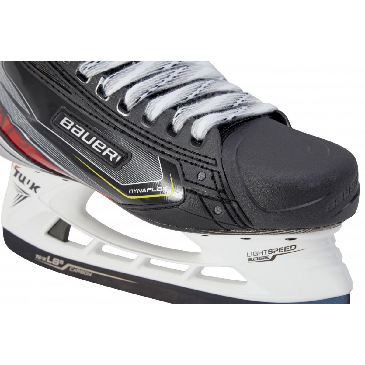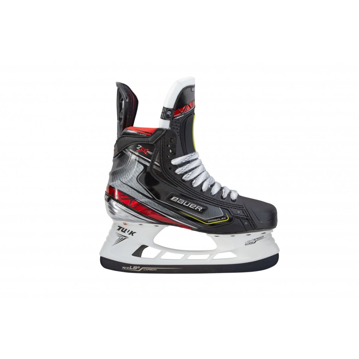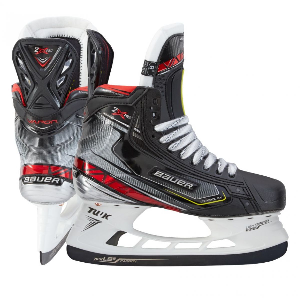 The flagship product is the Bauer Vapor 2X Pro Sr. Ice Skates. The skate's design and manufacturing process are based on the DYNAFLEX ULTIMATE PERFORMANCE system. Let's take a closer look at this system. The new asymmetric toecap, designed based on data from over 25,000 foot scans in SKATE LAB 3D scanners, enhances your kick. The integrated lacing system, made of injection-molded plastic, supports the foot, providing improved control of the skate and, consequently, movement on the ice. The asymmetric frame is designed to increase the player's speed and agility. The frame itself is made of a 3D-molded CURV® composite, which provides unparalleled ankle and heel support. Together with RECOIL PRO, which features double instep protection, it creates a powerful unit that helps players achieve the fastest speed and maximum from every kick. The comfortable COMFORT EDGE lining has been proven on the ankle edges. The AEROFOAM PRO ankle lining is also completely new, thanks to its premium thermoformable properties, perfectly adapting to the foot, increasing comfort by perfectly fitting the foot and adapting to its shape. The skate lining is covered with a quick-drying material with padded anti-slip sections that keep the foot in the skate and prevent unwanted movement, as well as the insole, which has special anti-slip grips. The skates are equipped with TUUK LIGHT SPEED EDGE blades, thanks to which you can change blades in a moment and stay in the game. The LS5 blades, thanks to their softer core, provide sharper edges that can be felt in turns. The skate sole is made of an ultra-light composite with ventilation holes. The skates can be thermoformed in certified Bauer ovens. Fit: D - Regular, EE - Extended. TECHNICAL PARAMETERS: Intended Use: Hockey, Sr. Field Player. TUUK LS5 Carbon-coated Blades. Material: 3-D Curv® Composite with X-rib. Recoil PRO Tongue. Blade interchangeability in the EDGE system. Yes. Thermoforming. Yes. Comfort Edge, AeroFoam Pro Lining.