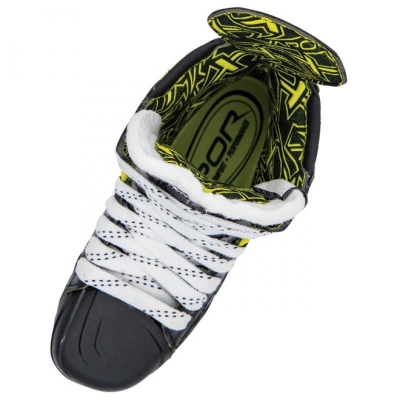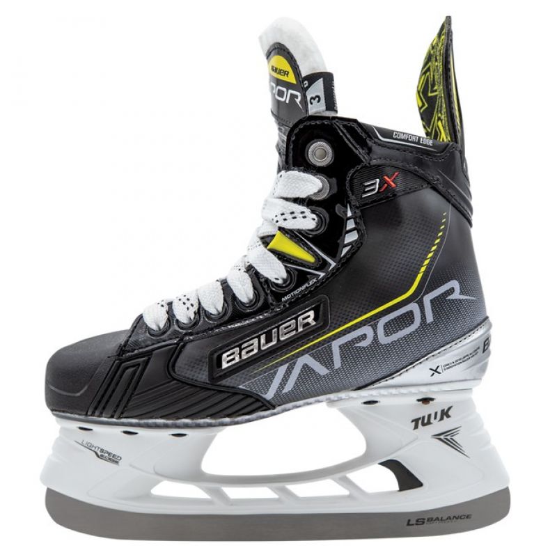 Bauer Vapor 3X Jr. Ice Skates: Junior Design and Development: The Digi Comp quarter-blade, with its softer construction and MotionFlex technology, increases the flexibility of the boot. For younger players developing their stride, this ease of flexing helps build good technique. LS Balance Blade: The combination of increased steel height and a 13-foot profile helps develop balance in all skating movements. A Better Fit for the Young Player: The asymmetrical toe cap, based on analysis of over 1,000,000 player foot scans, creates a better connection between the player's foot and the boot by minimizing negative space around the toes. The tongue padding provides a better connection between the player's foot and the boot. TECHNICAL SPECIFICATIONS: Intended Use: Hockey, field player, junior. LS Balance Blades: Material: Composite, Digi Comp+. Tongue: Felt with liner. Blades replaceable with the EDGE system. Yes. Thermoformable. Yes. Lining: Microfiber, Aerofoam.