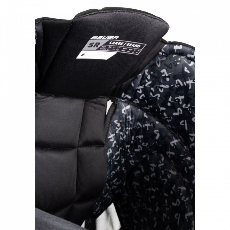 TECHNICAL SPECIFICATIONS Intended use: Ice hockey, field player, Sr. Material: Abrasion-resistant 400D nylon with ventilation zone Protection: Spine: Integrated spine protector with injected shield Kidney: One-piece protector with molded PE and MD foam Hip: One-piece hip protector, classic fit Thighs: Molded PE and MD foam Waistband: Waist strap with side buckle Adjustment: Padding: Sublimated water-repellent