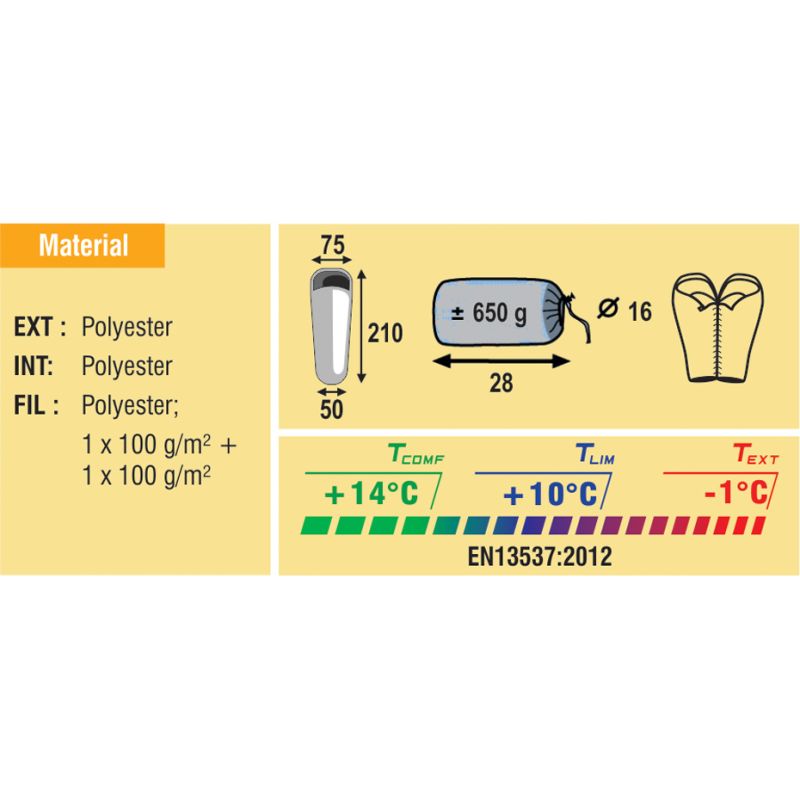 BEST CAMP WILLIWA SLEEPING BAG 210x75x50 zip-R 25037 A sleeping bag perfect for travel or long and short trips. It has a drawstring collar, a raised hood, and is characterized by exceptional thermal parameters. Extreme Temperature -1°C. FEATURES:- Highest quality materials- Stylish look- Temperature tested DIN EN 13537- Excellent temperature ranges- Possibility of connecting sleeping bags MATERIALS:- Filling: down 1x 100 gr/m²; top: 1x 100 gr/m² - Outer material: 100% Polyester- Lining: 100% polyester DIMENSIONS:- Package size: 28 x 16 cm- Length 210cm- Width 50cm- Weight 650g You can choose from a sleeping bag with a left or right side closure.
