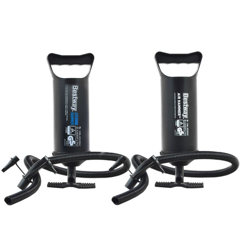 A pump with a large air chamber for fast inflation. Capacity 2 x 700 cm3. The pump is flow-through, i.e. it pumps during the up and down movement, and has a flexible hose.