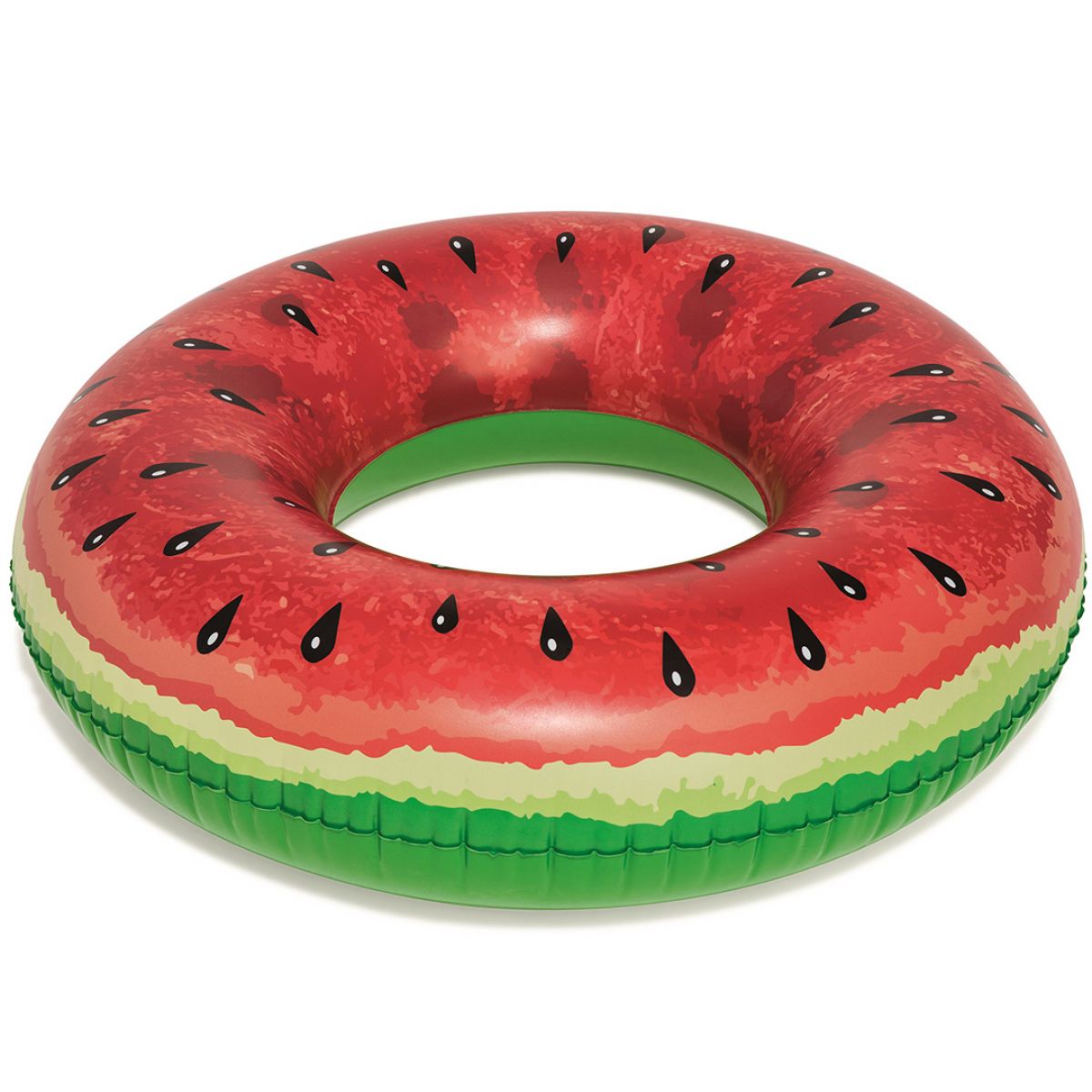 The Bestway inflatable swim ring captures the atmosphere of a tropical vacation, whether you're spending your vacation in a garden pool, by the lake, or on the beach. Fashionable, fruity patterns inspired by pineapple and watermelon. The vinyl is resistant to mechanical damage and abrasion. The valve is airtight. A repair patch is included.