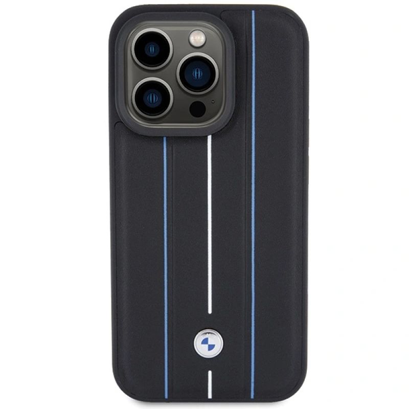 BMW Leather Stamp Blue Line Case for iPhone 15 Pro Max - Black