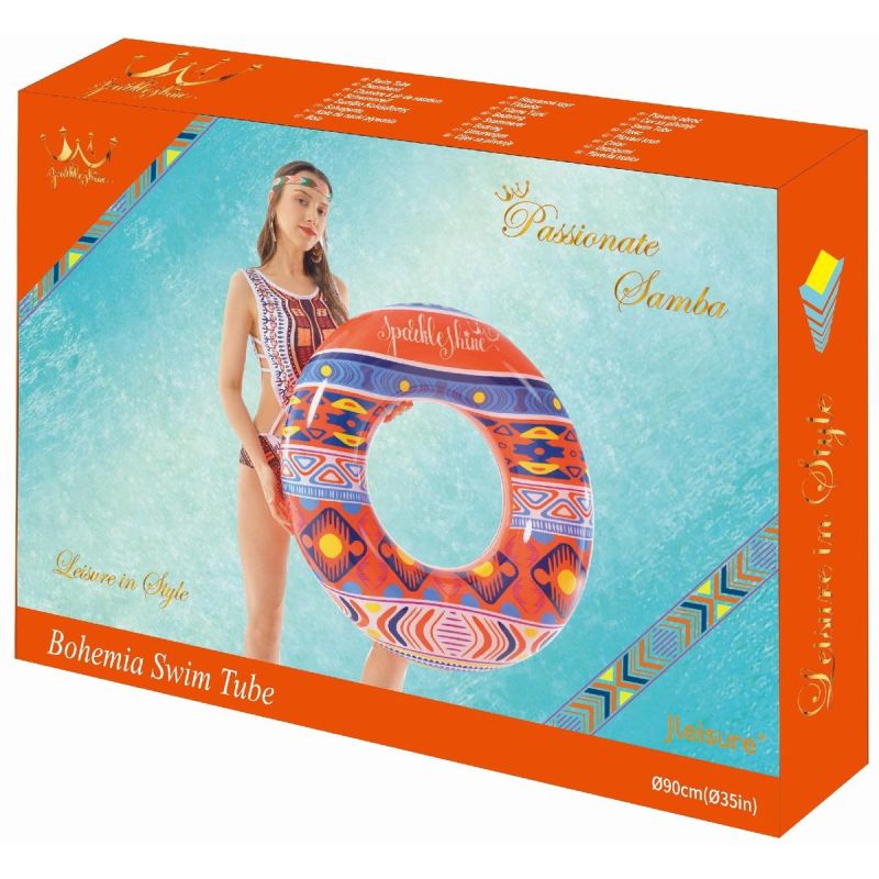 This JLeisure product from the SPARKLE SHINE line, in a boho style, lives up to the motto "Be spontaneous and free." It features bold, intense colors and patterns blended with a boho style that showcases the beauty of freedom and passion. It's perfect for both the beach and the poolside, providing a comfortable experience during your summer vacation and beyond. After the summer season is over, you can take the ring with you, for example, to an indoor pool. Made of thick 0.18 mm vinyl, it ensures long-lasting durability and, most importantly, resistance to UV radiation and pool chemicals. This unique, large, inflatable ring, with an outer diameter of approximately 79 cm, will impress any water lover!