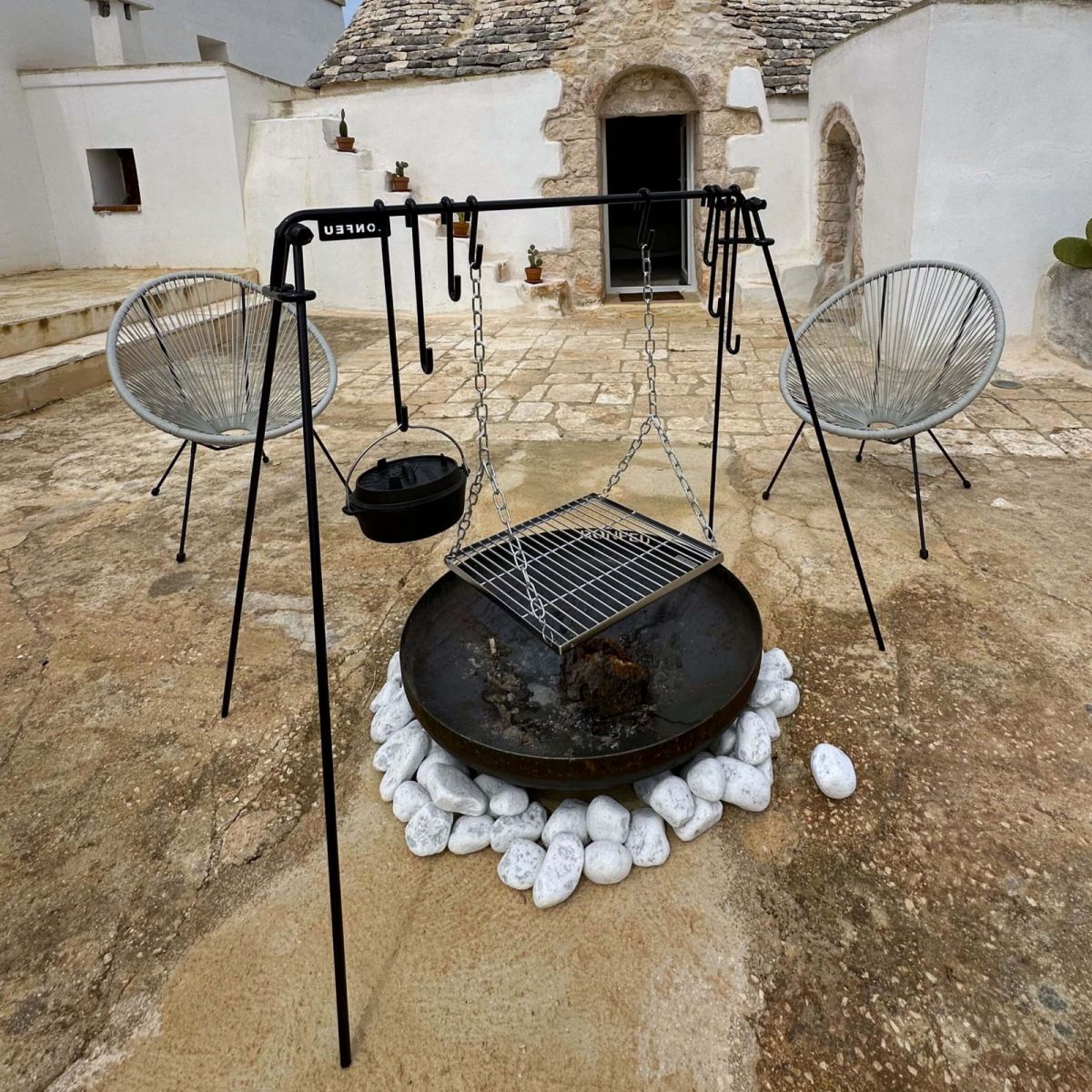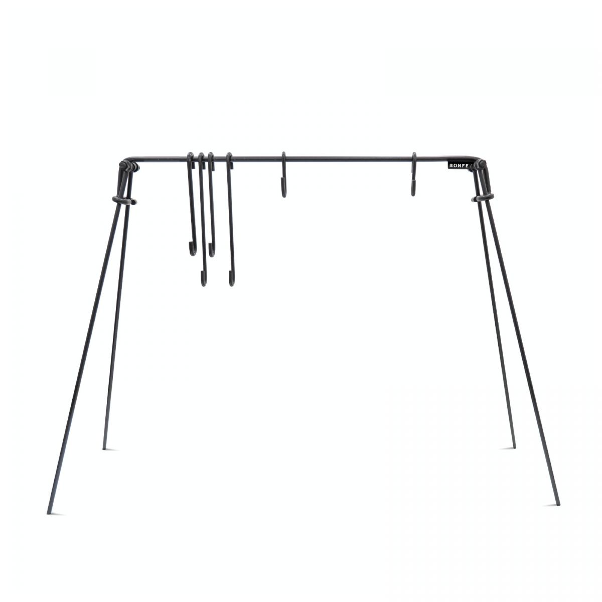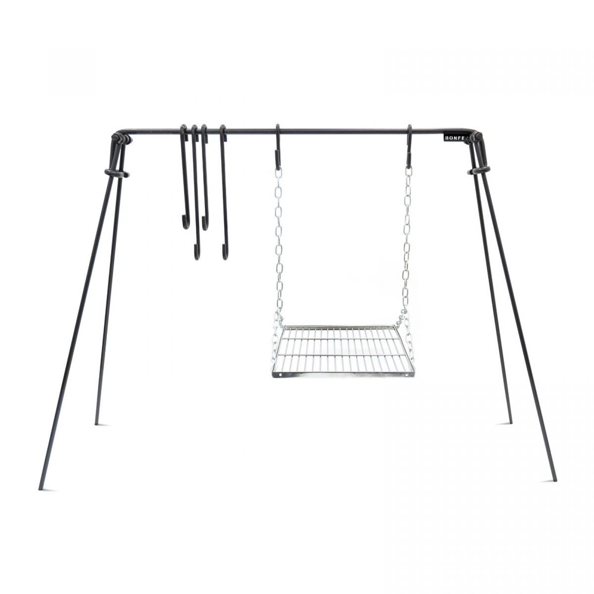 BonBridge is a sturdy and functional design that allows you to hang pots, pans, or grates directly over the fire. This ensures even heat distribution and prevents food from burning, allowing for safe and efficient open-fire cooking. Four hooks of varying lengths and an adjustable chain for hanging the grate provide complete control over the temperature and distance from the flames, allowing you to prepare a variety of dishes – from stews to grilled delicacies.