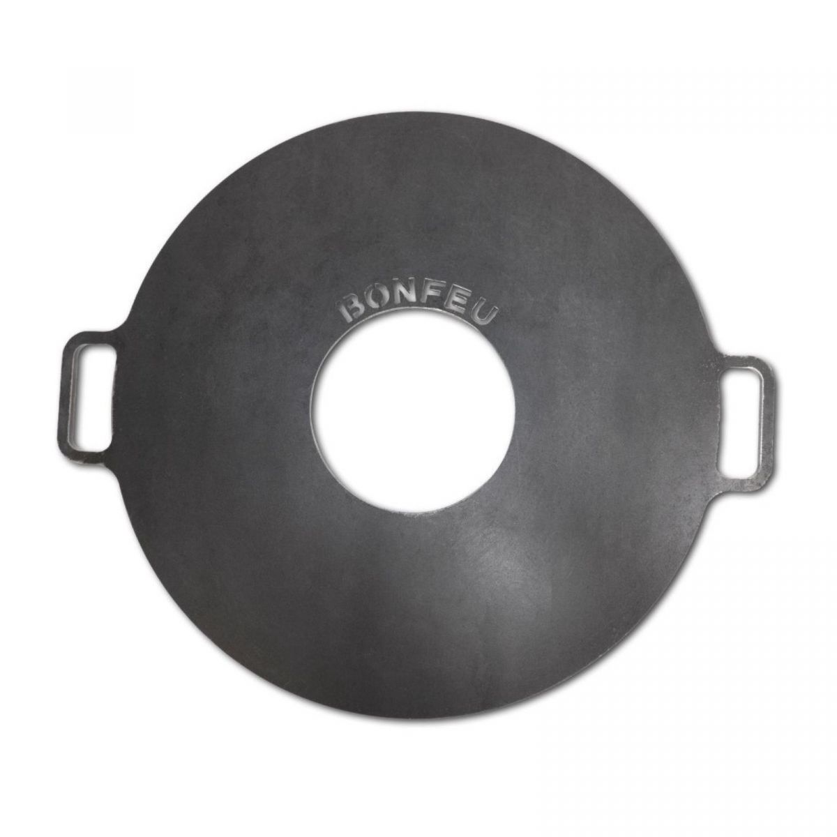 The BonFeu V34 Plancha is a 44 cm diameter, 6 mm thick steel grill plate designed specifically for the BonVes 34 model. It transforms your garden fire pit into a functional barbecue in seconds. Assembly is incredibly simple – simply place the plancha directly over the fire. Its ergonomic design ensures a comfortable working height for grilling and baking.
