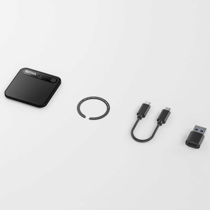 - Package contents: recorder, USB-C - USB-C cable, USB-C - USB-A adapter, magnetic ring