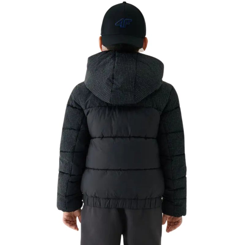 4F M621 Boy's Down Jacket, Deep Black 4FJWAW25TDJAM621 20S This 4F jacket for boys is perfect for chilly days in the fall and winter. Synthetic down enclosed in wide horizontal panels combined with 4FWarm technology guarantees protection against the cold and breathability. Hydrophobic material impregnation. Zonal rip-stop reinforcements. Regular fit. Elasticated hem. Fixed hood integrated with a high collar. A long zipper allows for individual thermoregulation. Two side pockets create additional space for small items. Technical data: Main material: 100% polyamide Main material 2: 93% polyamide, 7% polyester Lining: 100% polyester Filling: 100% polyester (synthetic down)