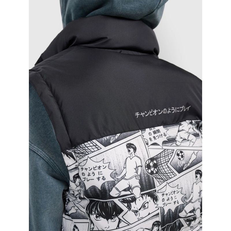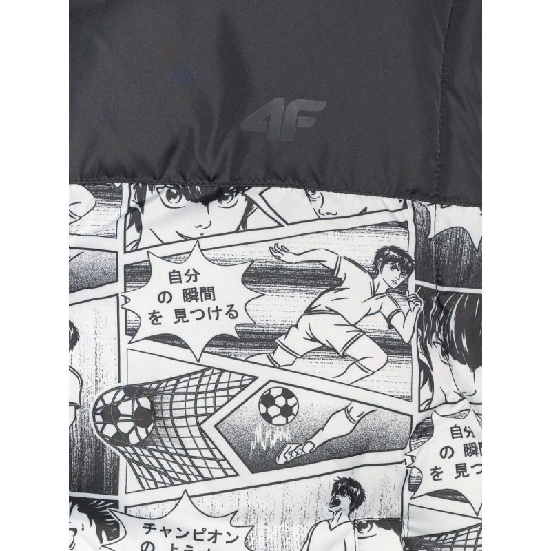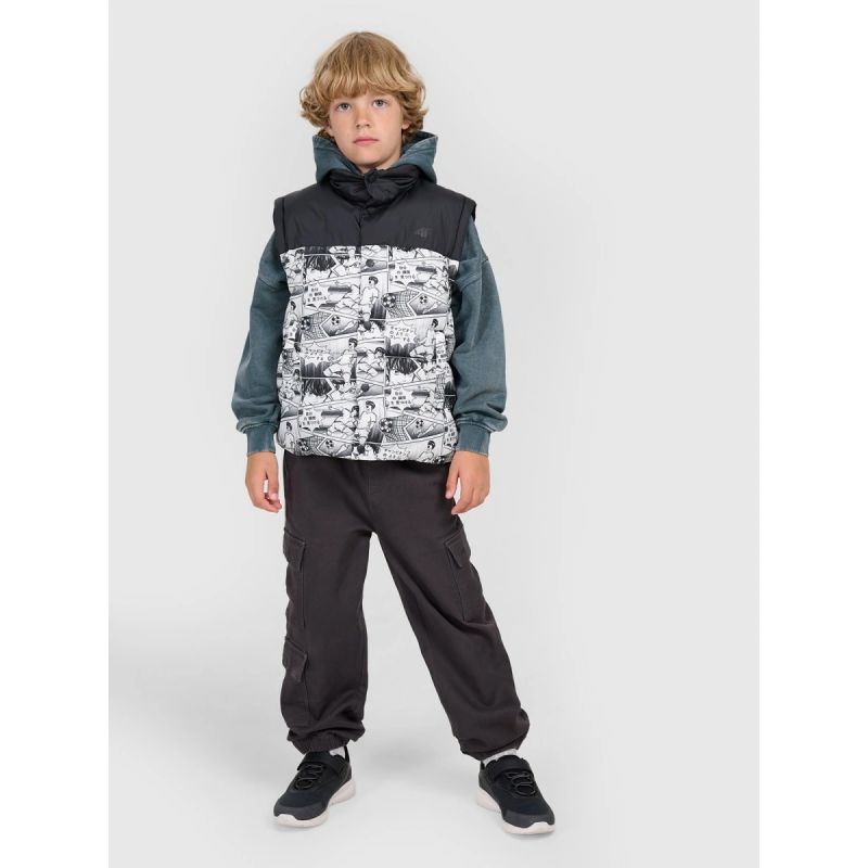 This boys' 4F down vest is a practical and lightweight layer for colder days. Synthetic down provides thermal insulation even in damp conditions, while 4FWarm technology helps maintain comfort during everyday activities. A hydrophobic coating reduces moisture absorption, helping protect against light rain and chilly temperatures. The oversized cut and standard hip-length ensure a comfortable, relaxed fit, while the low stand-up collar adds a sporty touch and protects the neck from the cold. The snap closure makes it easy to put on quickly, while two side pockets provide storage for small items. The adjustable hem with toggles allows you to adjust the fit to your body shape and the weather.