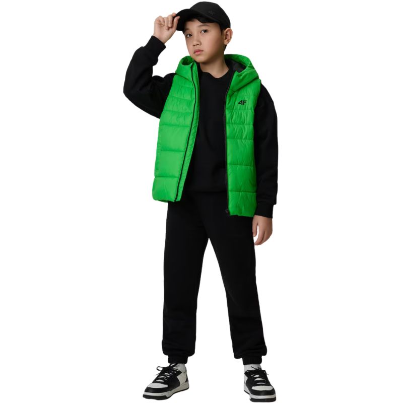 Boy's vest 4F M313 green 4FJWSS26TVJAM313 41S Boy's vest 4F is a practical insulating layer that is perfect for everyday use. Technical data: Main material: 100% polyamide Lining: 100% polyester Filling: 100% polyester 4FWarm technology - supports thermal comfort and helps maintain pleasant warmth Hydrophobic impregnation - limits water absorption and protects against moisture Light synthetic insulation - provides warmth without weight and facilitates everyday care Symmetrical quilting evenly distributes insulation and increases wearing comfort Hood and stand-up collar - protect against cold and improve comfort on windy days Zipper with inner pleat - helps retain heat inside Two open pockets - a safe place for small items Regular cut - fits comfortably on the body and does not restrict activity