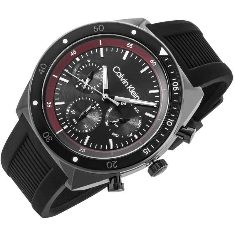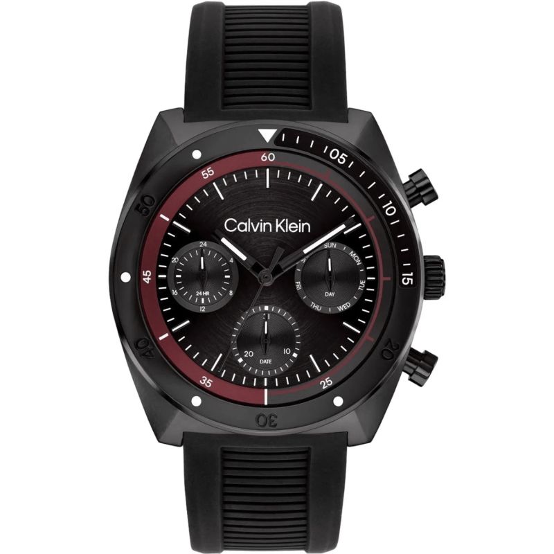 The CALVIN KLEIN CK Flex is a statement of urban style with a touch of adrenaline. The contrast of the black dial and burgundy bezel creates visual tension, as if the watch is about to take off. The dial features three subdials: a 24-hour display, a date display, and a day of the week indicator – all positioned for intuitive readability and balance. The solid bezel and expressive pushers enhance the watch's sporty yet sophisticated feel. A grooved rubber strap completes the look, offering comfort – sporty, practical, yet elegant. The CALVIN KLEIN CK Flex is a watch that's perfect for both the desk, dynamic meetings, and the evening – for quiet time to yourself.