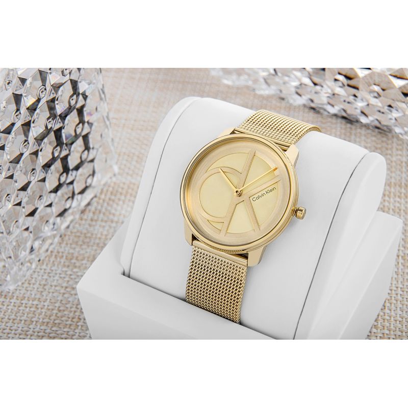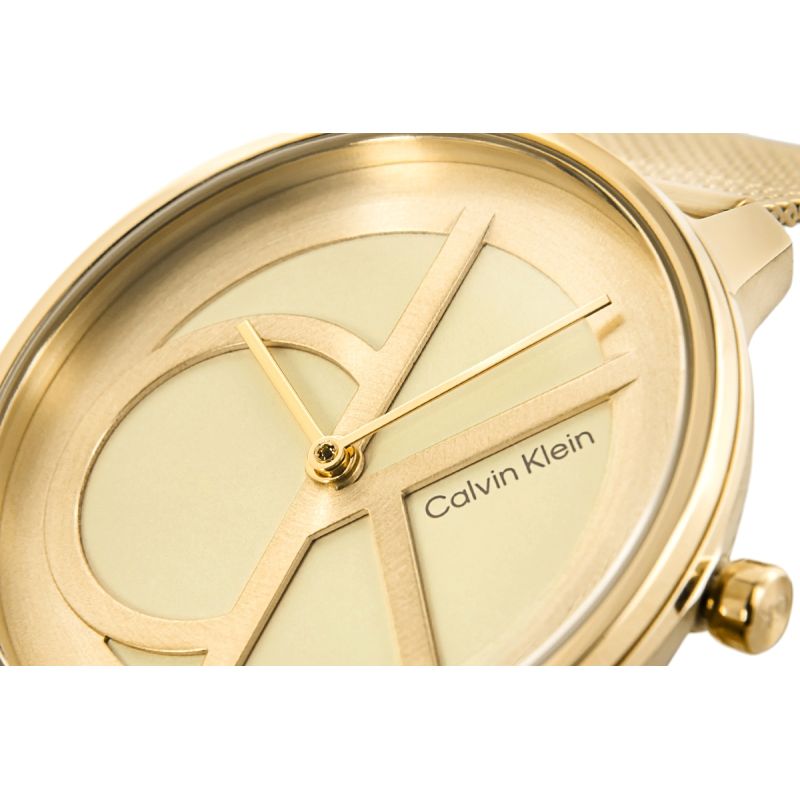A gold total look that doesn't need words to impress . Despite its expressive design, the timepiece maintains a subtle and light touch, easily integrating into both daytime and evening outfits. The gold dial, with its strikingly exposed "CK" monogram, creates a three-dimensional effect. Matte and shimmering surfaces intertwine, creating a unique play of light that draws the eye and adds a jewelry-like touch to the piece. The warm gold mesh bracelet wraps the wrist with exceptional lightness, like silk fabric. If you're looking for an accessory that will stand out from the crowd and set the tone for your day, you've found it.