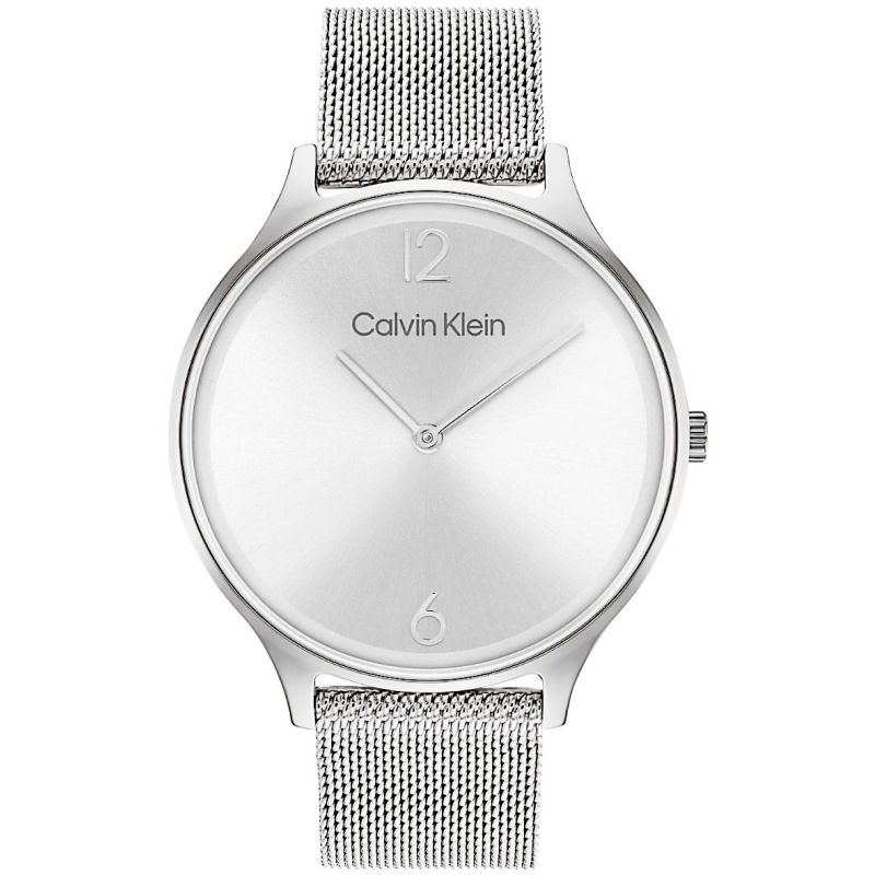 This model from the Calvin Klein women's collection captivates with its subtle form and refined simplicity. It's the perfect choice for women who appreciate quiet luxury, subtle detail, and timeless form. The light, radiantly brushed dial delicately reflects light, creating a soft shimmer. Details like the slim hands and minimalist 12 and 6 numerals lend the design a lightness and elegance. The silver-tone mesh bracelet wraps the wrist with exceptional ease, like silk fabric. For those who know that the simplest things can be the most beautiful.