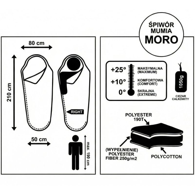 This model is perfect because it combines solid 250 g/m2 insulation, durable 190T fabric and a comfortable mummy construction, ensuring comfortable sleep even at lower temperatures.