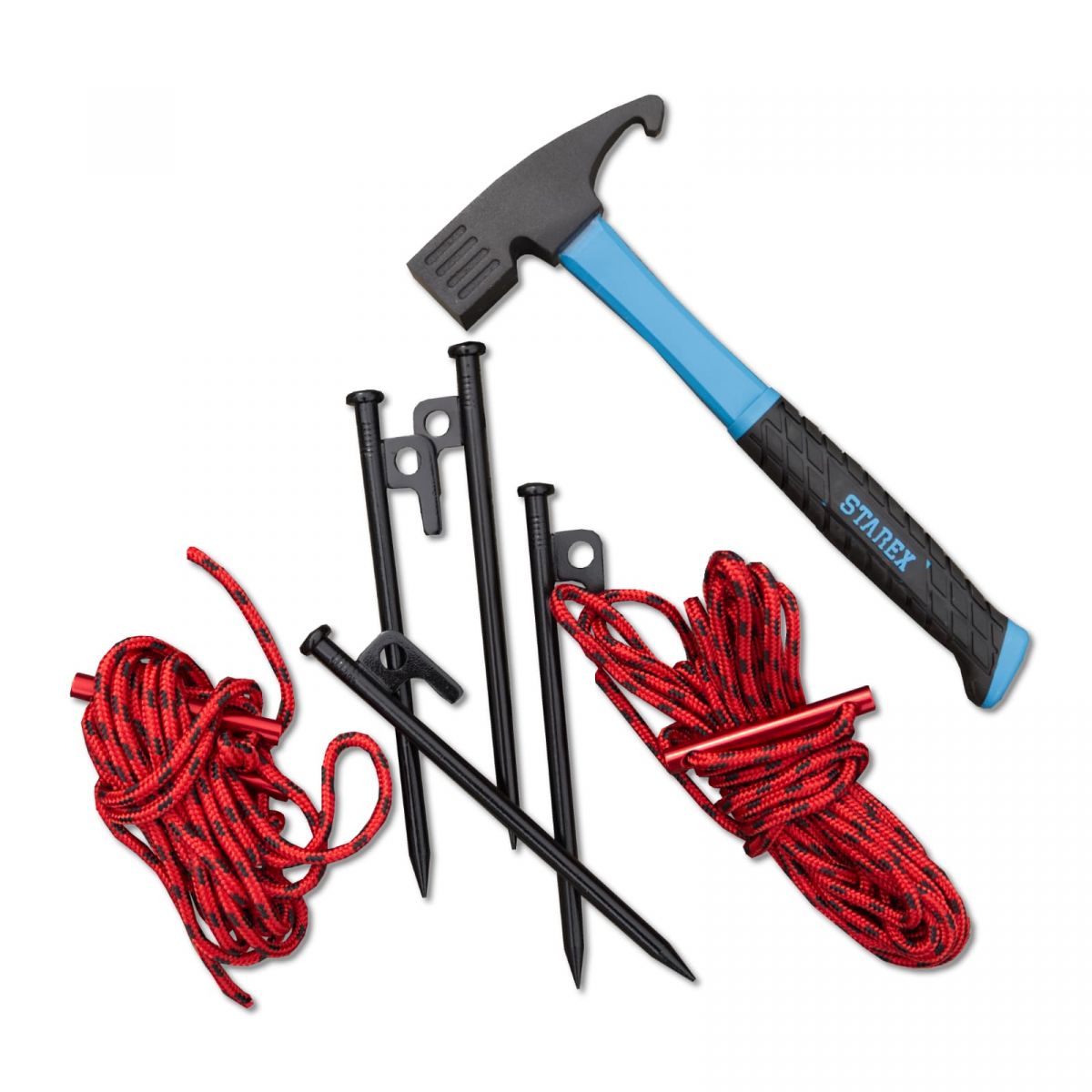 The set includes: roof, 2 adjustable posts, 4 pegs, 4 tensioning ropes, hammer