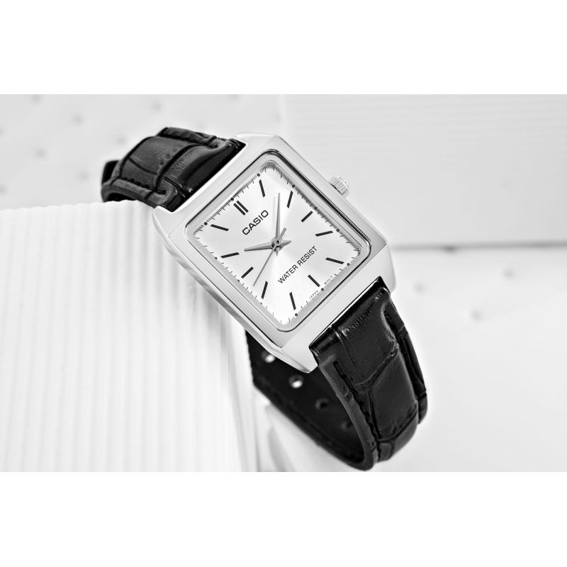 This Casio watch was created for women who value understated beauty and understated luxury. The watch's size perfectly fits the female wrist, subtly accentuating its slenderness and delicacy. The strap texture is embossed leather with a slightly shiny finish and a distinct pattern inspired by the natural texture of crocodile skin. It gives it a luxurious and classic look that complements the minimalist silver case design. Perfect for work, elegant occasions, or everyday wear, it will always highlight your unique style and class.