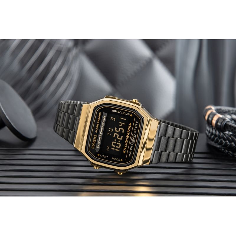 If you're looking for a watch that combines '80s vibes with a modern finish, the A168WEGB-1BEF will hit the spot. It's a completely new take on a Casio digital classic – a black dial, gold details, and a black ion-plated bracelet create a style that speaks volumes. Since its launch in the late '80s, the A168 series has achieved iconic status. This model remains faithful to the original design, which won the prestigious Good Design Long Life Design Award . But it's not just about looks. This is a watch that delivers: electroluminescent EL backlight , 1/100th-second stopwatch , daily alarm , automatic calendar , and a battery that lasts up to 7 years . Just put it on and wear it.