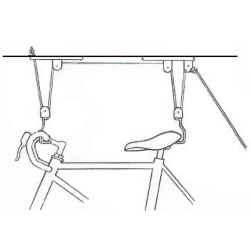 The bike is secured using two hooks . One attaches to the handlebars, the other to the saddle. Each hook is coated with a special rubber that prevents accidental scratching of the lifted bike.