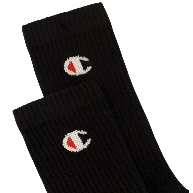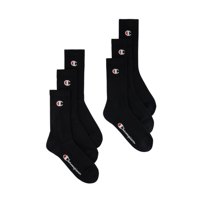 Champion 6-Pack Black Socks U20005 KK001 Champion socks are perfect for everyday wear. The predominantly cotton material allows the skin to breathe. The addition of synthetic fibers improves durability and flexibility. The elastic, high cuff prevents pressure and stabilizes the socks. Reinforced toe and heel areas. This pack contains 6 pairs of socks. Material: 70% cotton, 28% polyester, 2% elastane