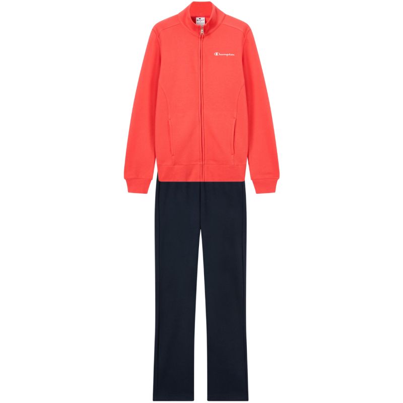 Champion Women's Full Zip Suit Orange and Navy Blue 118289 RS073 The Champion women's tracksuit is perfect for everyday wear. Soft-touch fabric with a high cotton content. Polyester fibers added. Standard fit. One-way zipper. Ribbed cuffs and hem. Open pockets. Trousers with small leg slits and an adjustable drawstring elastic waist. Pocketless trousers. Material: 55% cotton, 45% polyester.