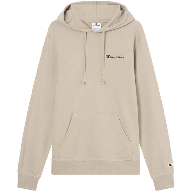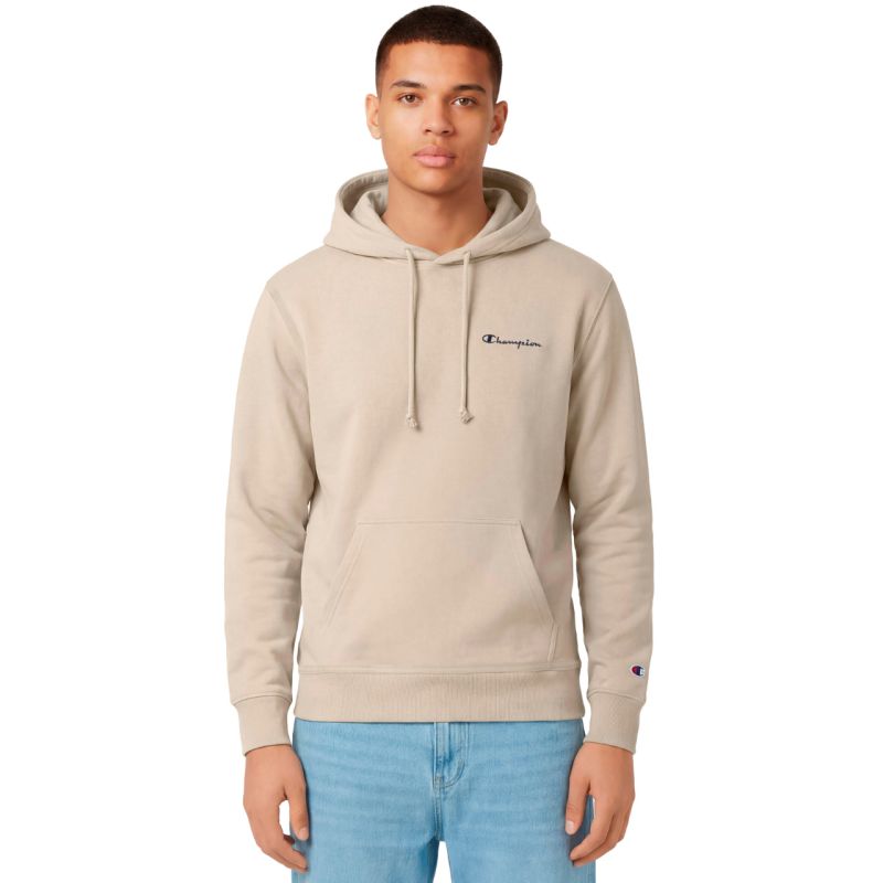 Champion Men's Hooded Sweatshirt Beige 221791 MS041 This Champion men's sweatshirt is perfect for everyday wear. Standard fit. Fixed, adjustable hood. Ribbed cuffs and hem. Front pocket. Logo on chest and sleeve. Material: 70% cotton, 30% polyester