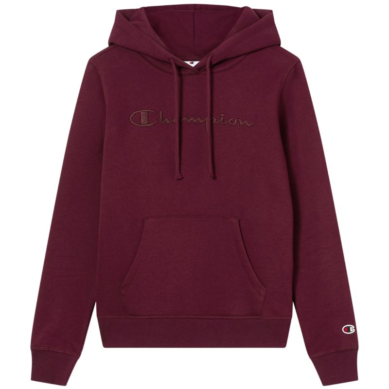 Champion Women's Hooded Sweatshirt, Burgundy 118379 RS522. This Champion women's sweatshirt is perfect for everyday wear and active wear. Fitted fit. Fixed, adjustable hood. Insulated interior. Ribbed cuffs and hem. Front pocket. Logo on chest and sleeve. Material: 70% cotton, 30% polyester.