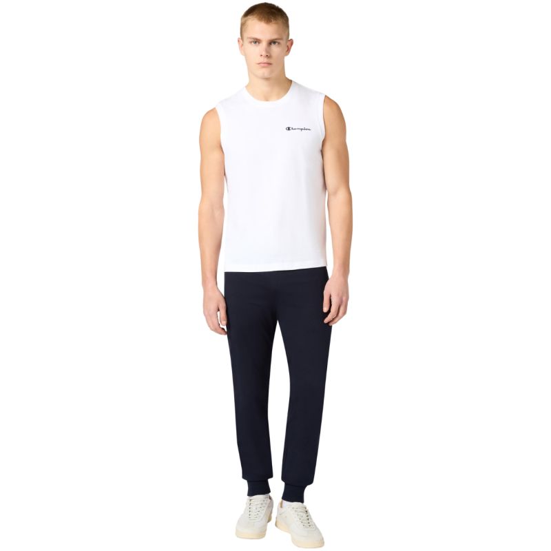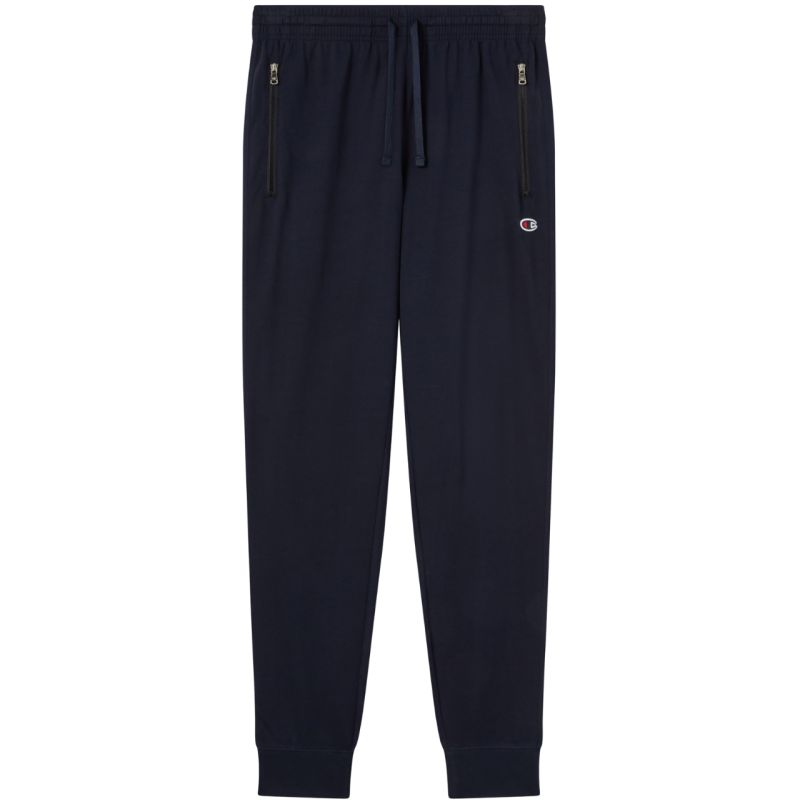 Champion Men's Rib Cuff Pants Navy Blue 220807 BS501 These men's Champion sweatpants showcase a modern style. They feature a slim fit and a subtle brand logo. Soft cotton. Elastic waistband with an external drawstring. Zippered side pockets. Ribbed cuffs allow you to show off your footwear. Material: 100% cotton