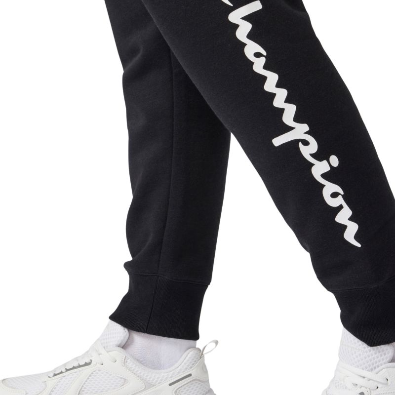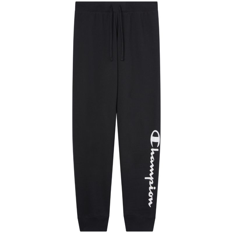Champion Women's Rib Cuff Pants Black 118429 KK001 Champion women's pants let you express your streetwear style every day. Slim fit with cuffs at the lower legs. Soft-touch fabric. Elastic waistband with external drawstring. Large logo on the left leg. Material: 55% cotton, 45% polyester