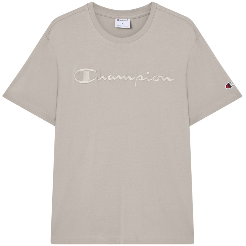 Champion SS Tee Beige 220273 ES035 Men's T-Shirt. This Champion men's t-shirt is perfect for everyday wear. Regular fit. Small logo on the sleeve. Large logo on the chest. Soft-touch fabric. Material: 100% cotton.