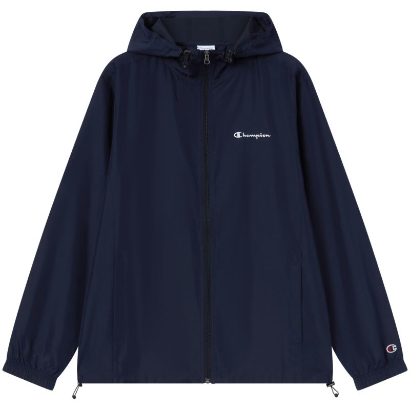 Champion Windbreaker Men's Jacket, Navy Blue 222272 BS501. This men's windbreaker jacket is perfect for transitional seasons. It's made of lightweight, water-repellent polyester that protects against wind and light rain, ensuring comfort. It features a standard fit. Zip closure. It has an adjustable, fixed hood. Side pockets and elastic cuffs enhance comfort. It has a drawcord-adjustable hem with toggles. It's finished with an embroidered Champion logo on the chest. Material: 100% polyester.